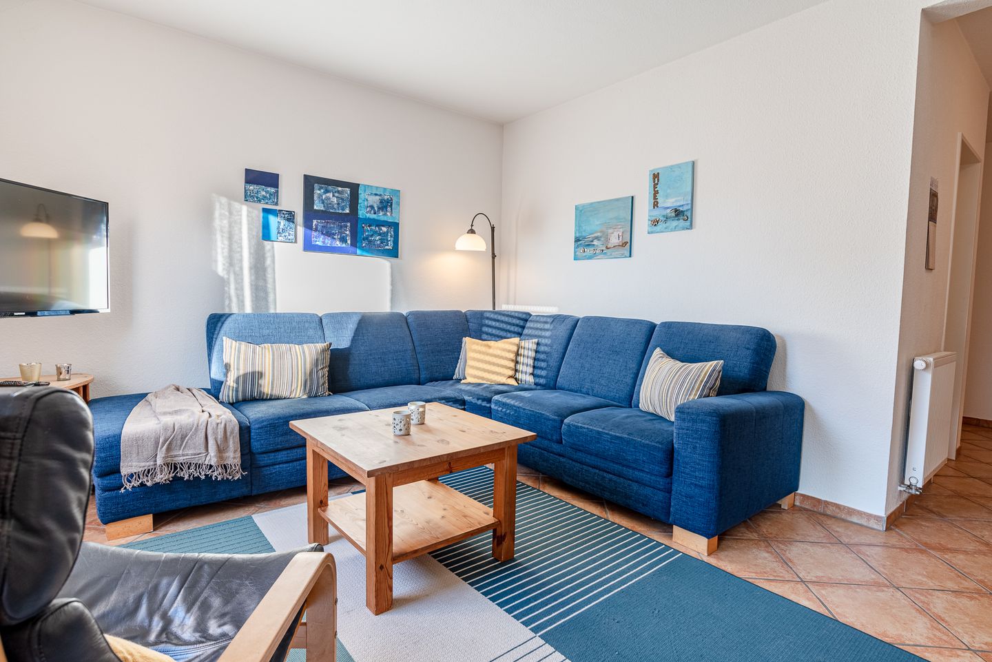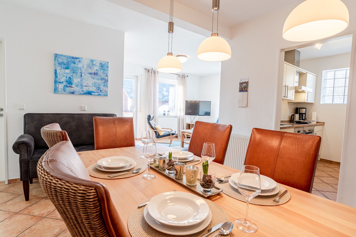 Die Ferienwohnung besticht durch ihre moderne Einrichtung und eine helle, freundliche Atmosphäre. Der offene Wohnbereich ist der perfekte Ort zum Entspannen und Verweilen. Hier finden Sie eine gemütliche Sitzecke, die zum Lesen oder gemeinsamen Spielen einlädt, sowie einen Essbereich, an dem Sie gesellige Mahlzeiten genießen können. Die voll ausgestattete Küche bietet alles, was Sie für die Zubereitung Ihrer Lieblingsgerichte benötigen.