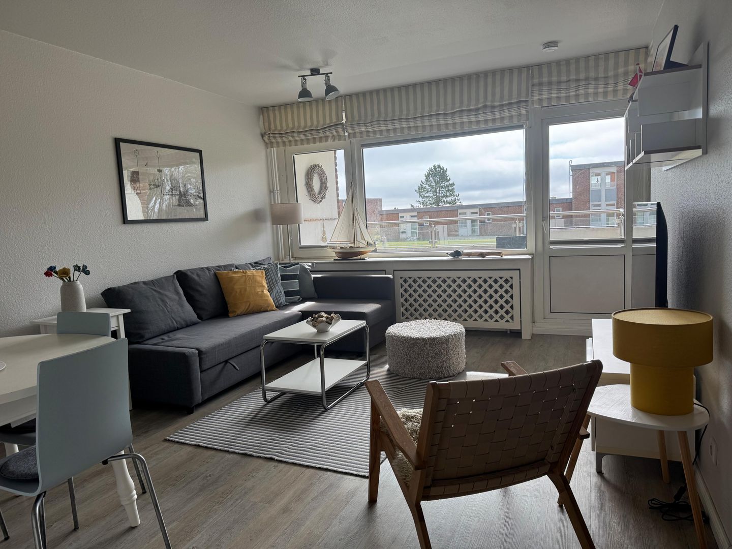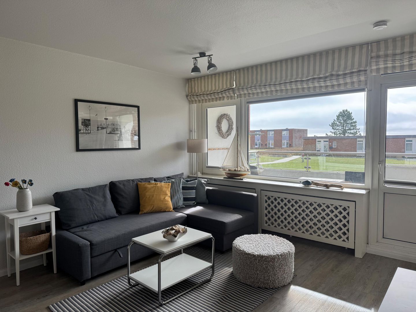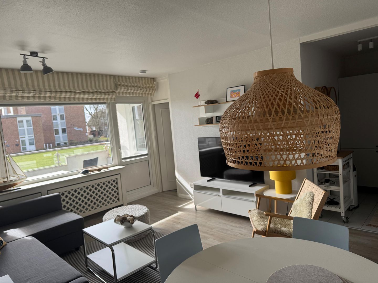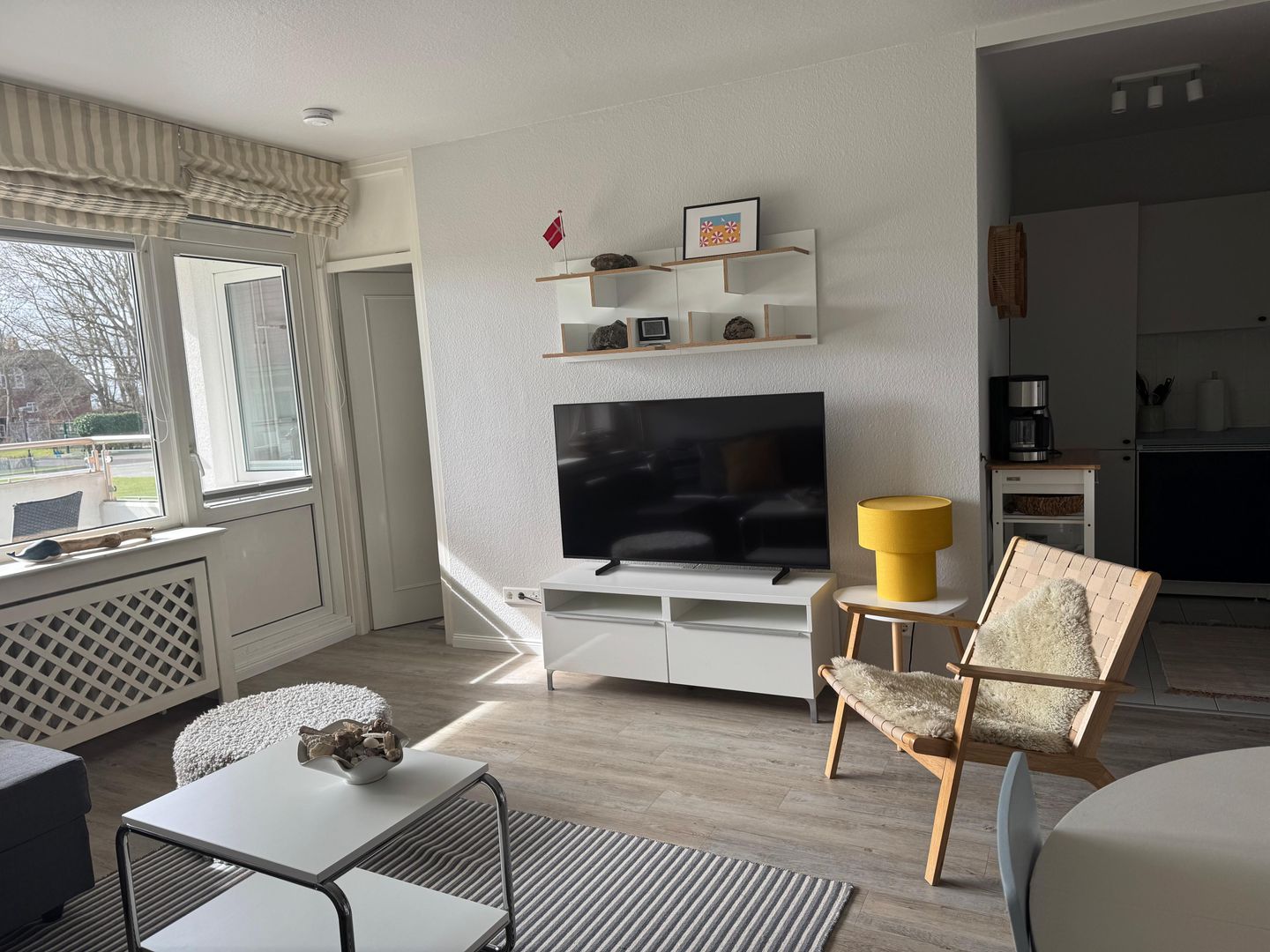 Der Wohnbereich ist freundlich geschnitten und mit Sofaecke, Sessel, Esstisch sowie TV mit Satellitenanschluss, Radio und DVD-Spieler ausgestattet. Die offene Küche ist zum Wohnzimmer hin gestaltet und bietet mit Cerankochfeld, Backofen, Mikrowelle, Kühlschrank mit Gefrierfach, Spülmaschine, Kaffeemaschine, Toaster sowie umfangreichen Küchenutensilien eine praktische Ausstattung für die tägliche Selbstversorgung. Ein Schlafzimmer und ein Badezimmer mit bodengleicher Dusche, WC, Waschbecken, Spiegel, Kosmetikspiegel und Haartrockner ergänzen das Raumangebot sinnvoll.