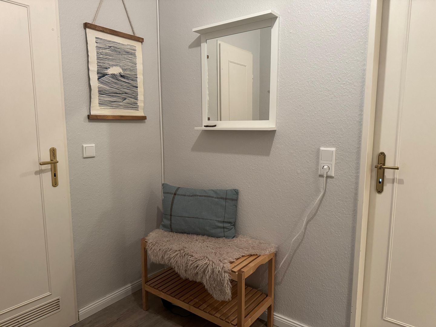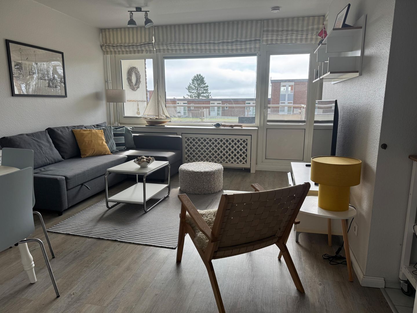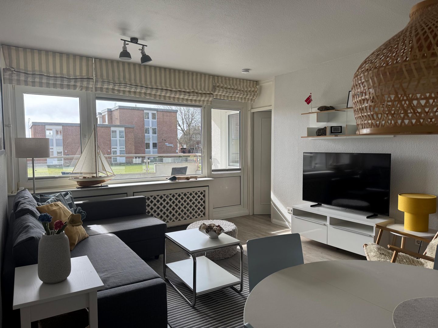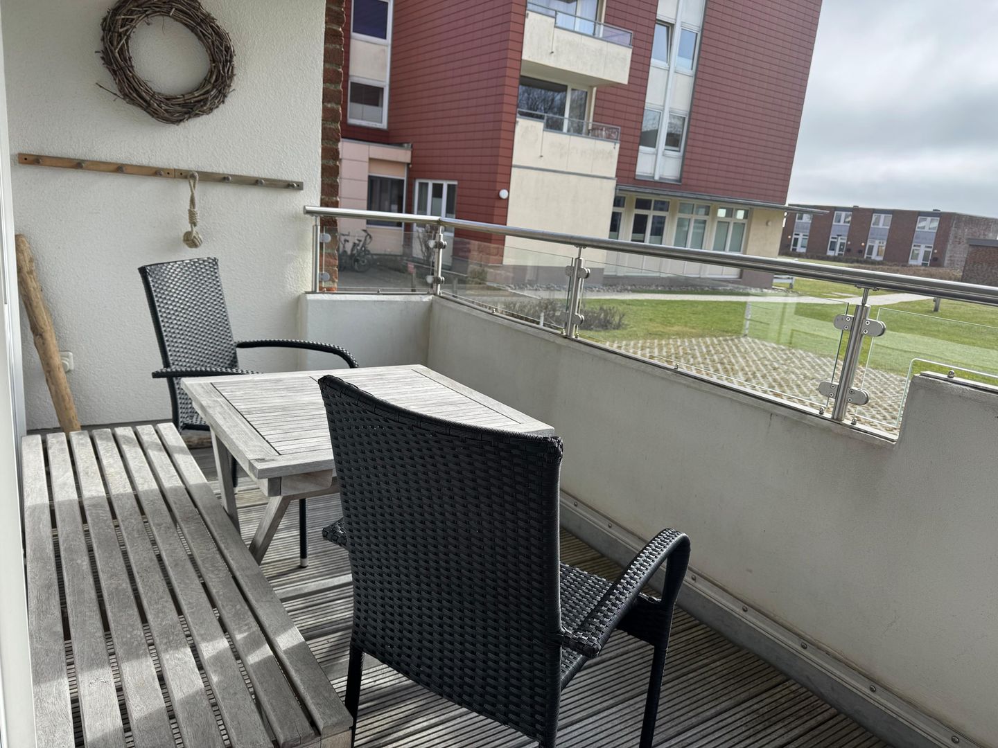 Zum Aufenthalt gehören außerdem WLAN, Bettwäsche, Handtücher, Badetücher und eine Erstausstattung. Waschmaschine und Trockner stehen zur gemeinschaftlichen Nutzung zur Verfügung. Ein Wäscheständer, Bügeleisen, Staubsauger und Reinigungsmittel sind ebenfalls vorhanden. Der überdachte Balkon mit Gartenmöbeln und Sonnenschirm lädt zum Verweilen ein, während der Gartenblick für eine angenehme Atmosphäre sorgt.